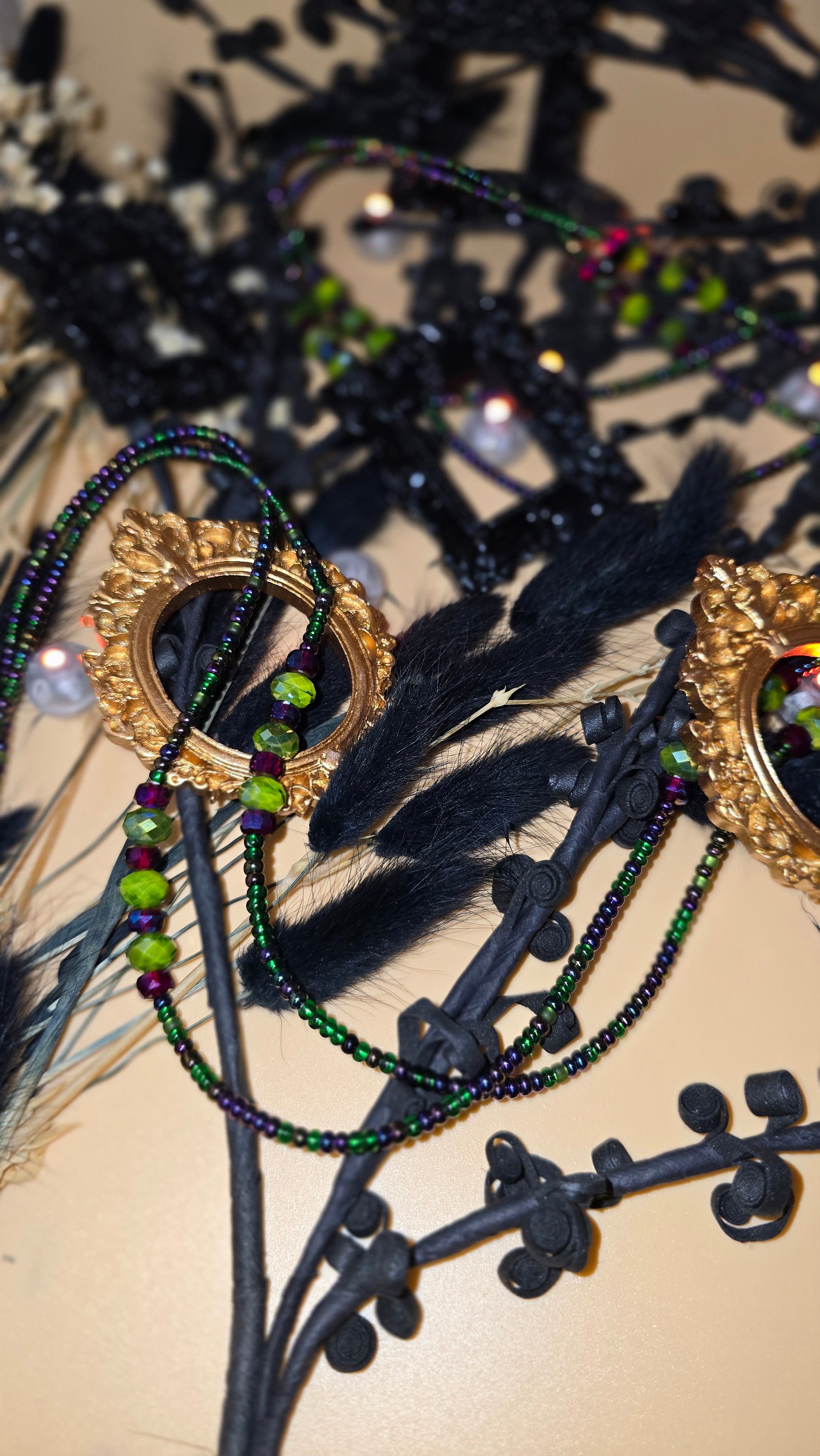Enchanted Eclipse captures the shimmer of moonlight meeting dark magic — an ethereal waistbead crafted with luminous green and iridescent purple beads that shift with every movement. Each strand embodies the balance between light and shadow, beauty and mystery.