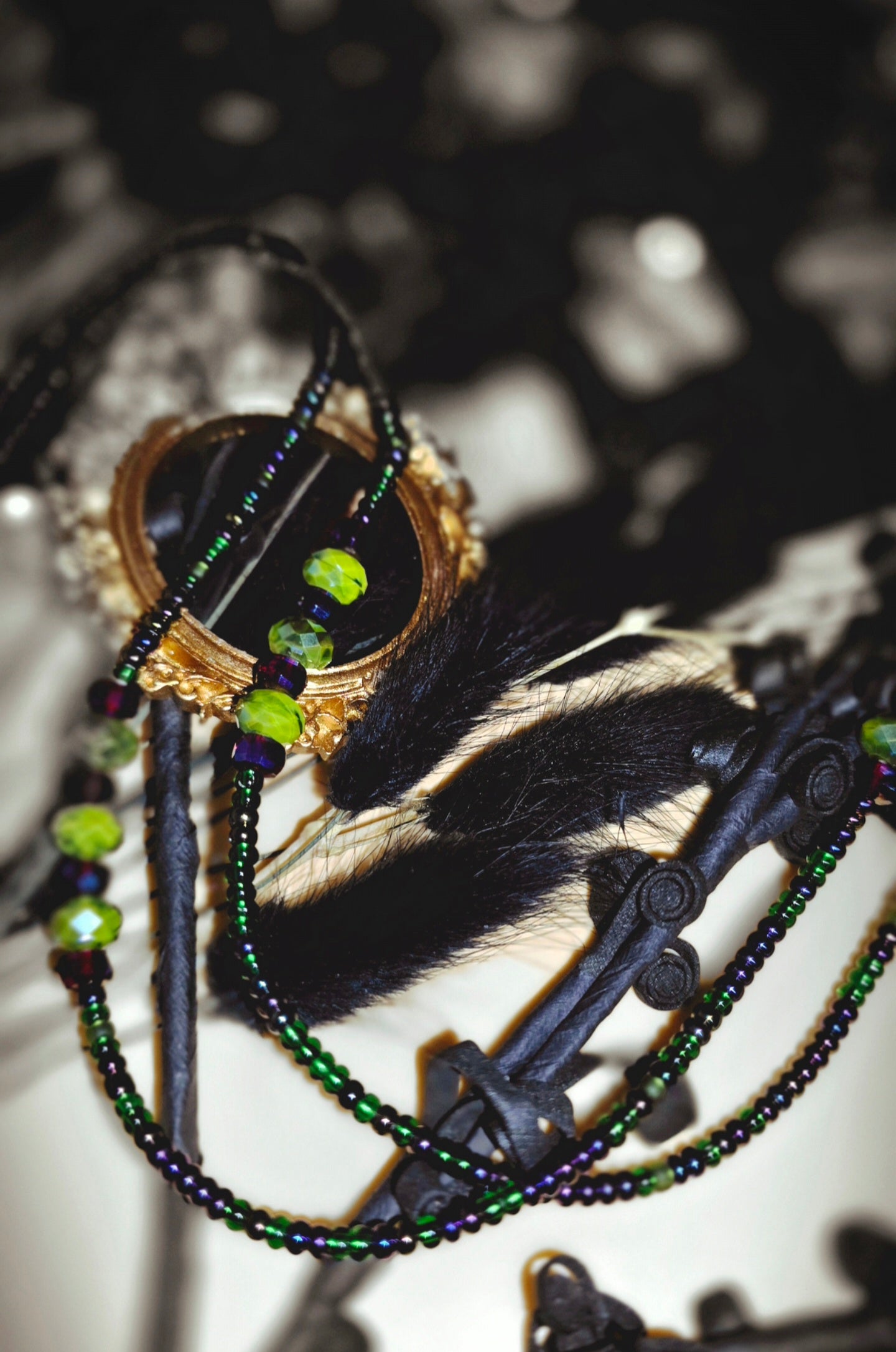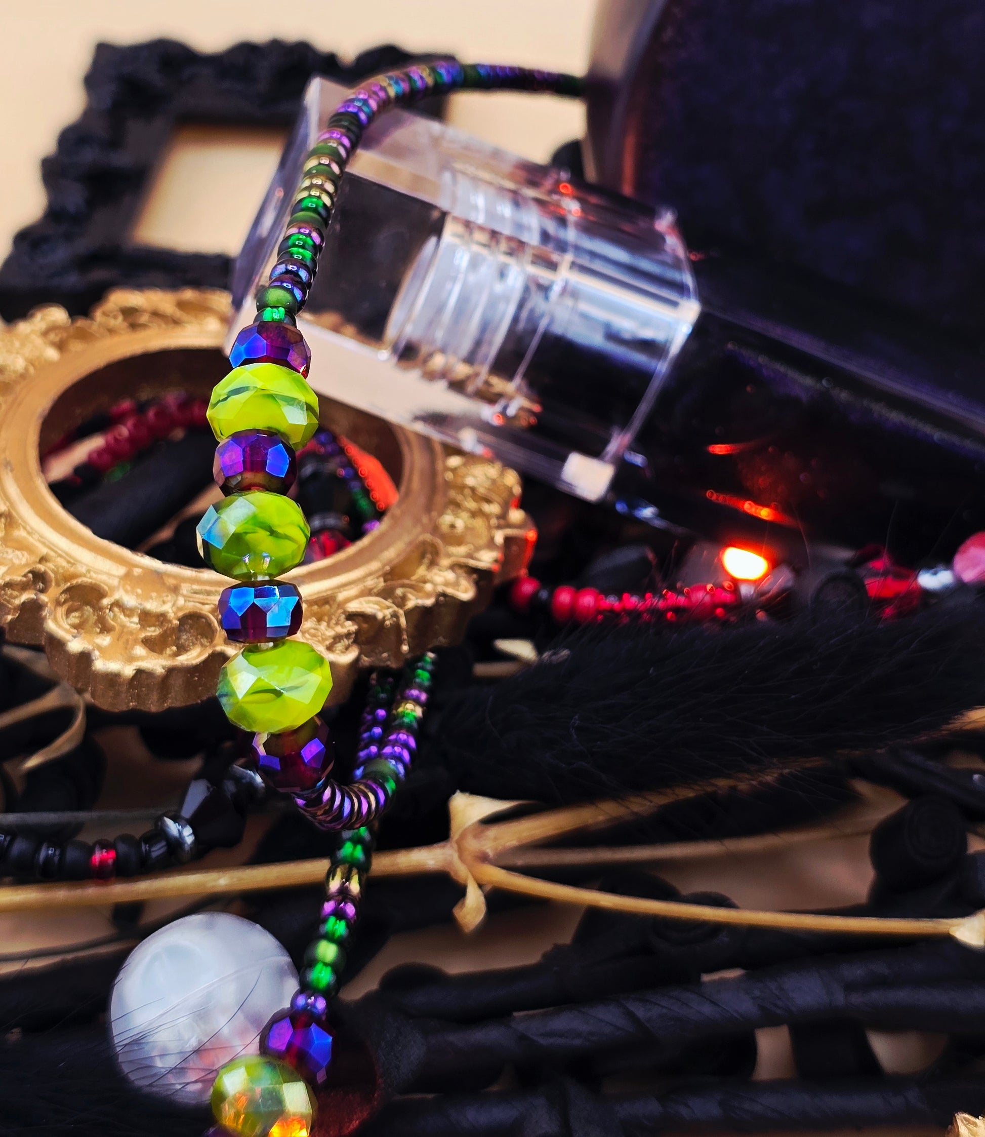💎 Details: Iridescent glass beads in cosmic hues of green, violet, and black