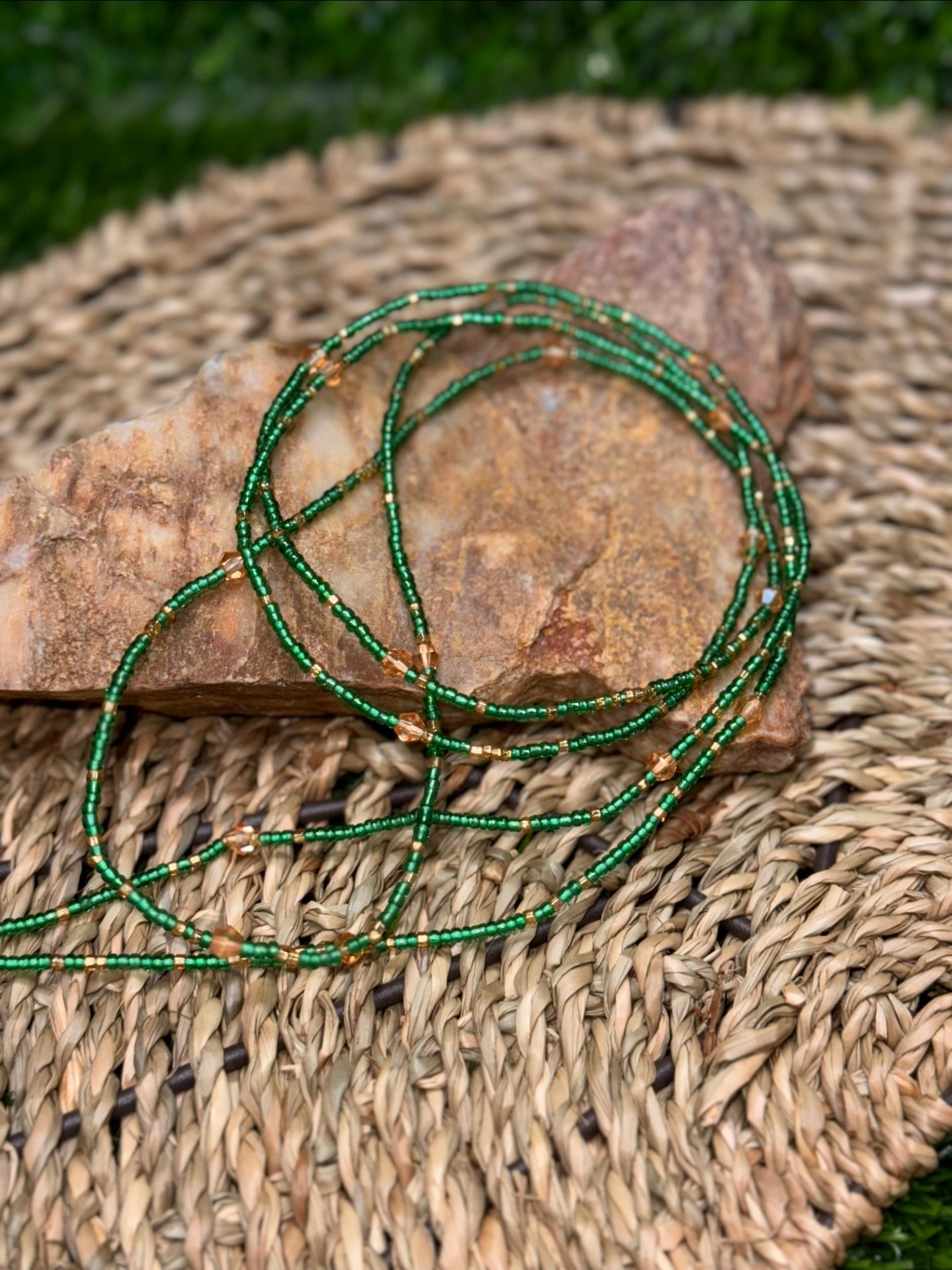 Celebrate the richness of the season with Evergreen, a radiant strand of deep green beads accented with golden crystal shimmer. Handcrafted as a 50-inch traditional tie-on, this adornment is designed for a custom fit that embodies growth, prosperity, and balance. Whether layered or worn solo, Evergreen is a timeless reminder of resilience and abundance.